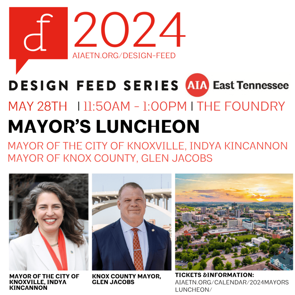 Join AIA East Tennessee and Proficient Engineering for our Annual Mayor’s Luncheon with City of Knoxville Mayor Indya Kincannon and Knox County Mayor Glen Jacobs. IN-PERSON TICKET SALES ARE NOW